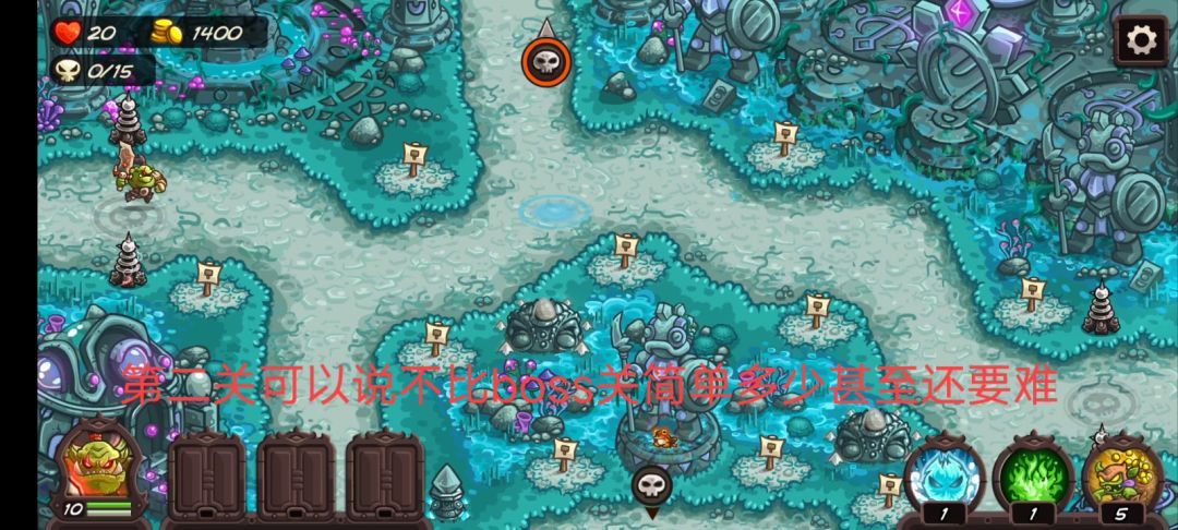 本关难度偏难 本关难点: 面对这种地形不知道怎样布局度过金币有限的前期 前期的追猎者依然很难处理,后面出的看守者有法师套盾很肉 中期法师高伤害以及博学者高爆发有些无力 后期下面看守者加魔抗上面毁灭者加物抗太肉难处理 解决方法: 前期上面一坟墓,重点布局左上方为后面上方出怪防守做准备 看守者+法师出来时英雄把法师灭掉减少压力 博学者的高爆发可以利用石像鬼恶魔哥布林挡刀 后期同样法师优先让英雄去处理,坟墓记得升控制技能控怪缓解压力 本关要合理利用蛋的无敌效果,关键时刻恶魔哥布林配合蛋能支撑很久 成就:本关中间鱼人守卫雕像底下有一只橙色青蛙,点击后获得“荣耀归于催眠魔娃”成就