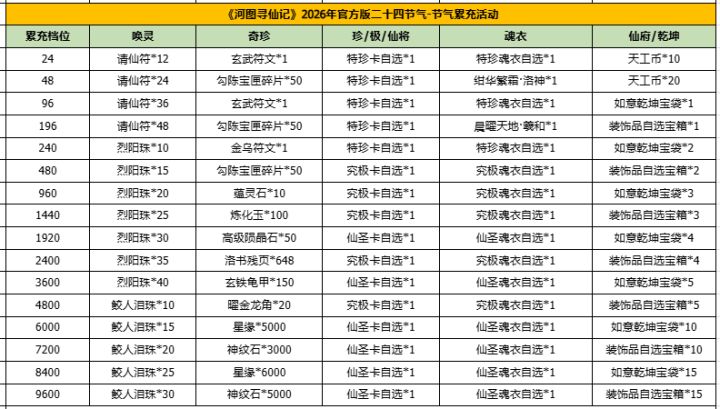 仙君大人:提前祝您节气快乐~【二十四节气之谷雨】累充&返利活动将于2026/4/20 00:00开启活动有效时间:2026/4/20 00:00-2026/4/20 23:59💦谷雨返利💦活动模式:全周期内活动时间:2026/4/20 00:00-2026/4/20 23:59活动内容:所有真实充值档位全返代金券,返利比例高达24%。1、本次活动只计算充值金额,代金券充值部分不计入返