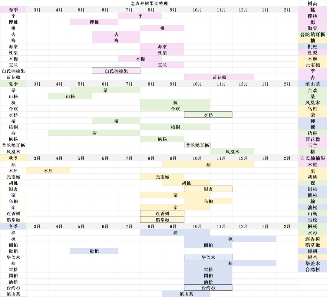 首先我们先来认识一下老农种树的所有树种,其中标红色的是稀有树种,而蓝花楹、凤凰木、滇山茶凭借不能通过预约得到和花期的超高颜值也受到了山友们的欢迎,那么我们怎样在游戏里得到它们呢? 常规稀有树种:白氏喃喃果(春);水杉、普陀鹅耳枥(夏);银杏、连香树、鹅掌楸(秋);华盖木、台湾杉(冬) 特殊树种:蓝花楹(春)、凤凰木(夏)、滇山茶(冬) 获得方法: ①预约 以立春立夏立秋立冬划分季节,春季通过预约有