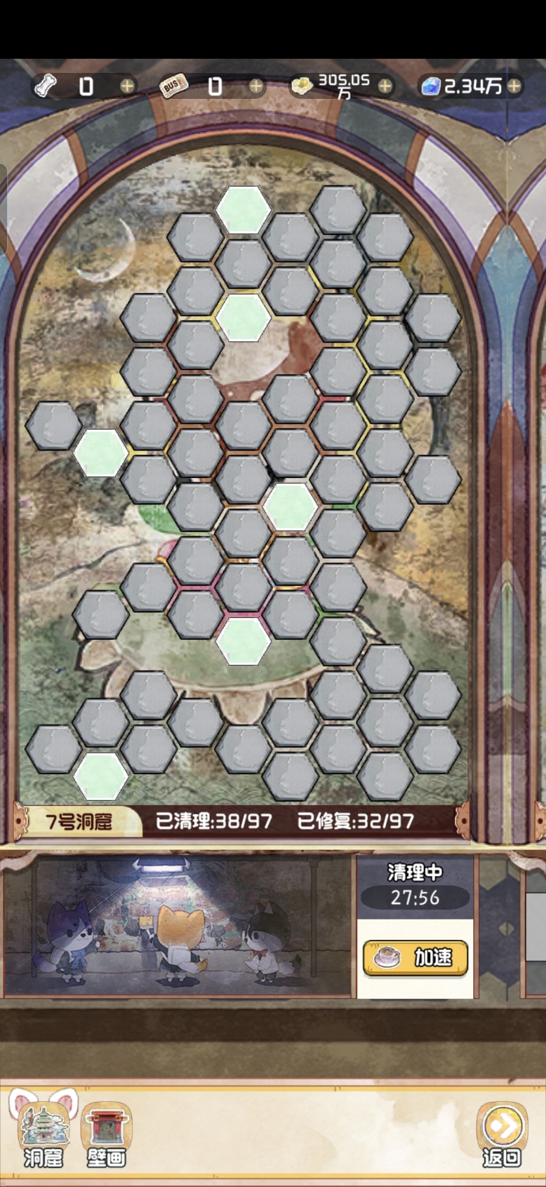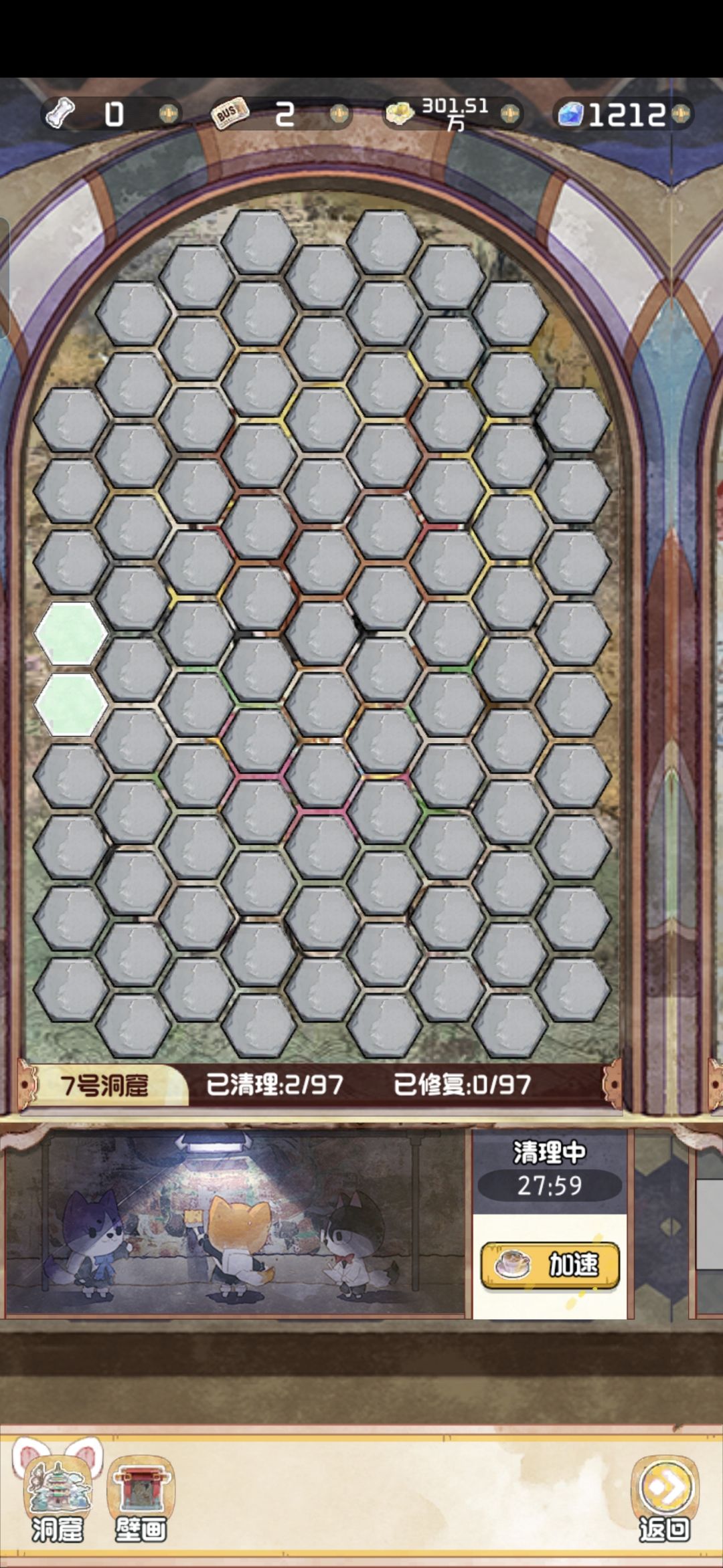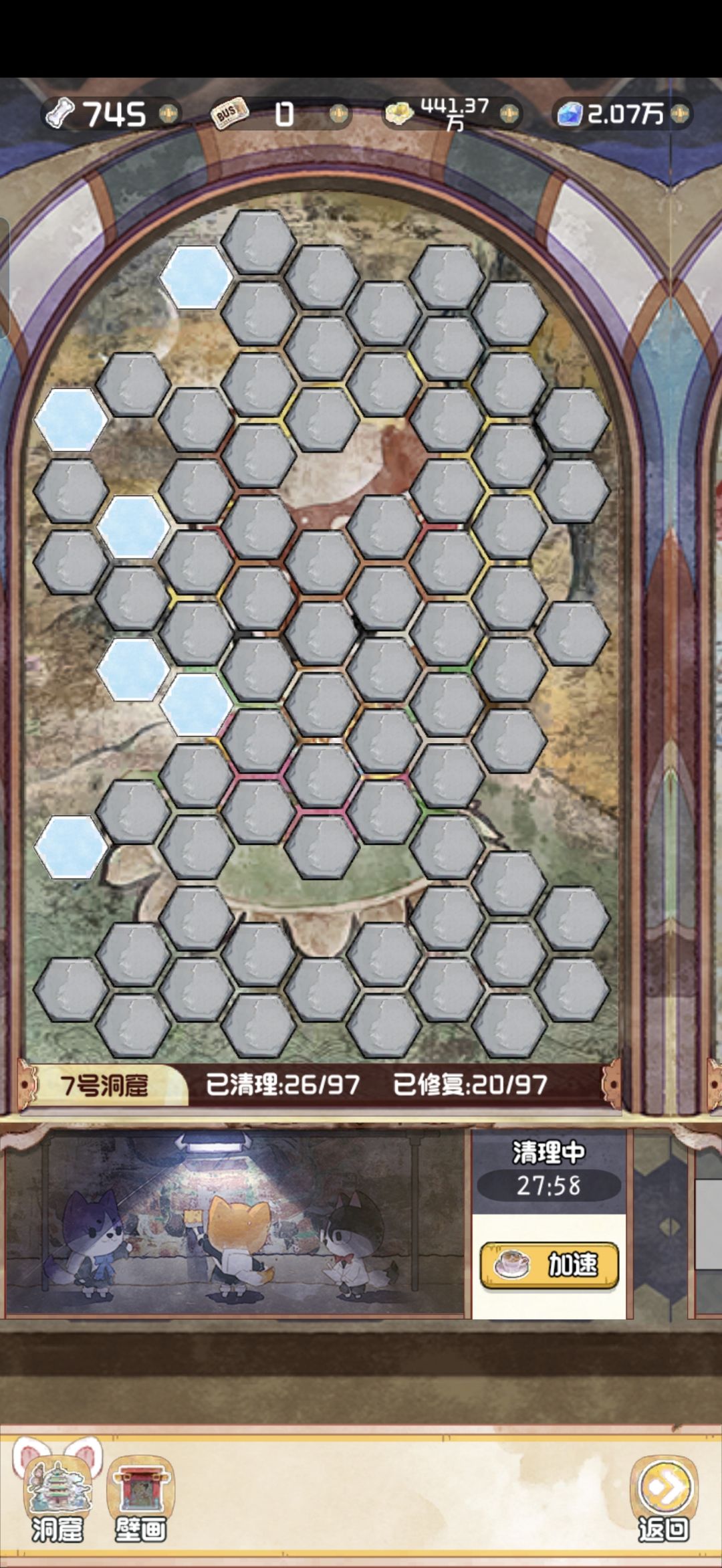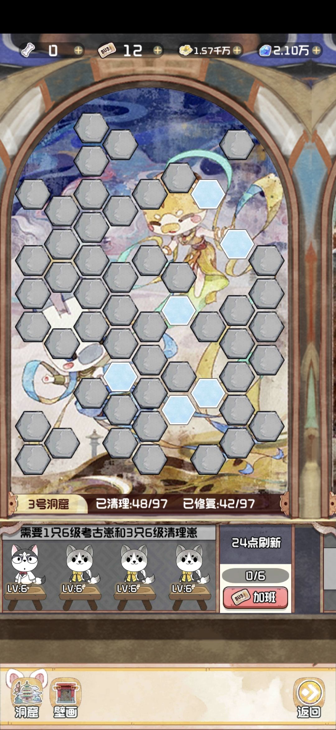 12.28 随着版本今天的更新,云顶洞窟的大饼也是终于烙好了。 其实核心机制就是狗子探险。你可以理解为换了一款小游戏的老探险。只不过这里的文物碎片是靠通关小游戏获得,狗子是用来开启锁定的关卡。 里面主要有两个游戏,一个是数涂,一个是拼图。数涂过关之后可以获得文物碎片和拼图碎片。拼图每拼完一个完整的,可以增加1500点人气值。这个还是很可观的,相当于一个天地兽首了已经。 拼图的游戏机制就不赘述了,相