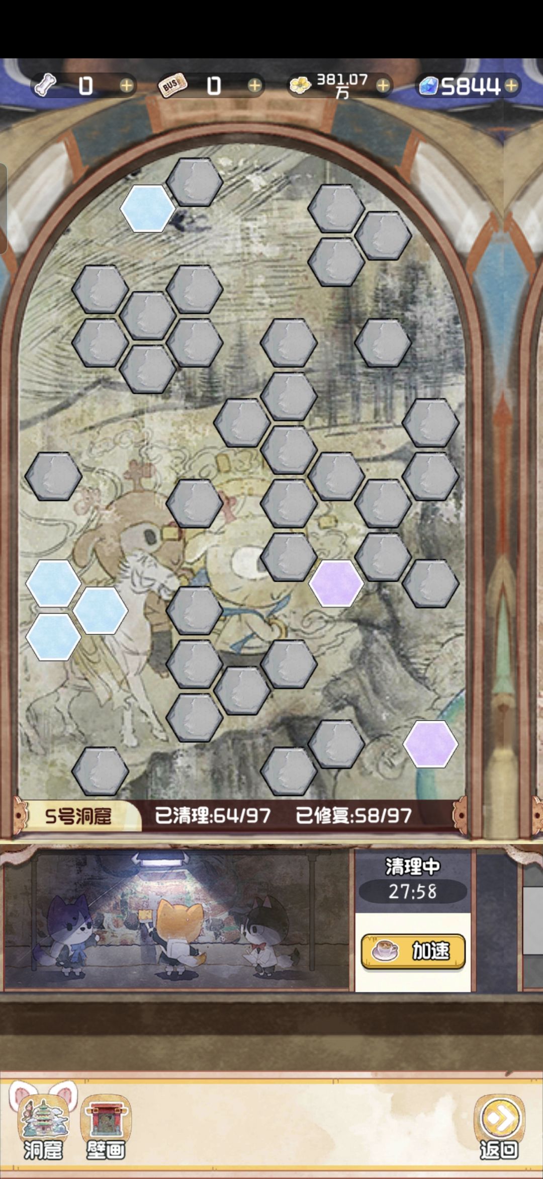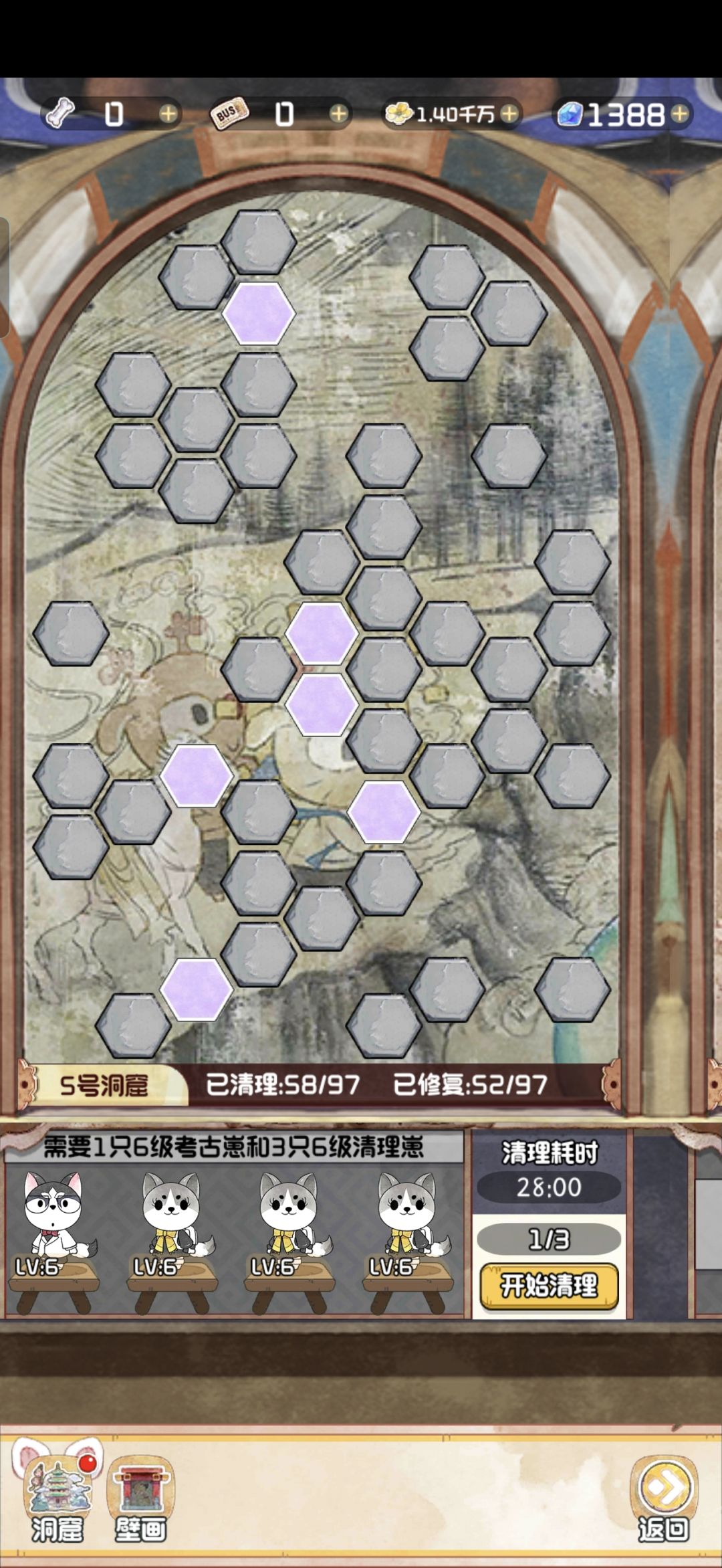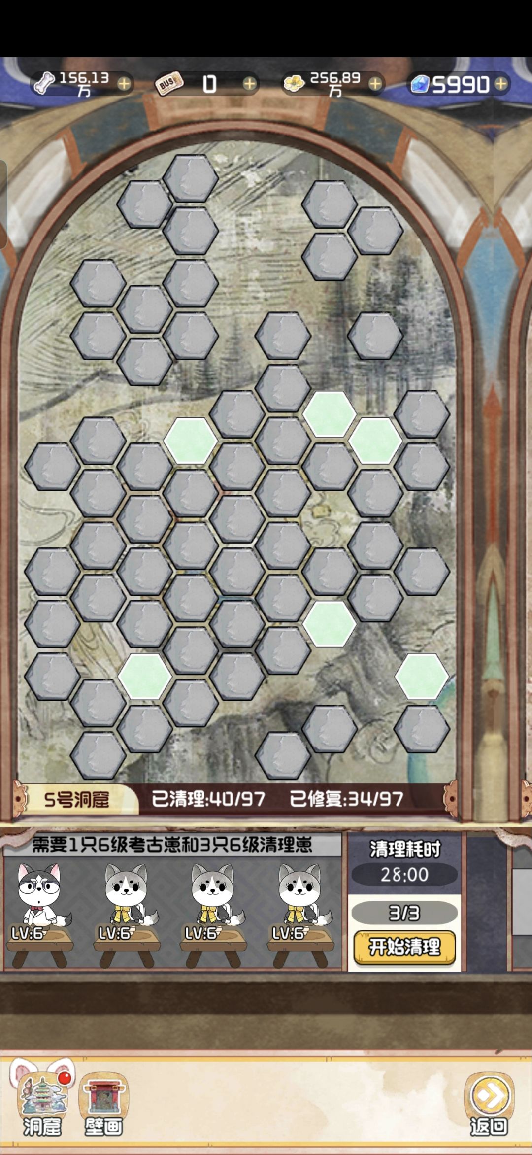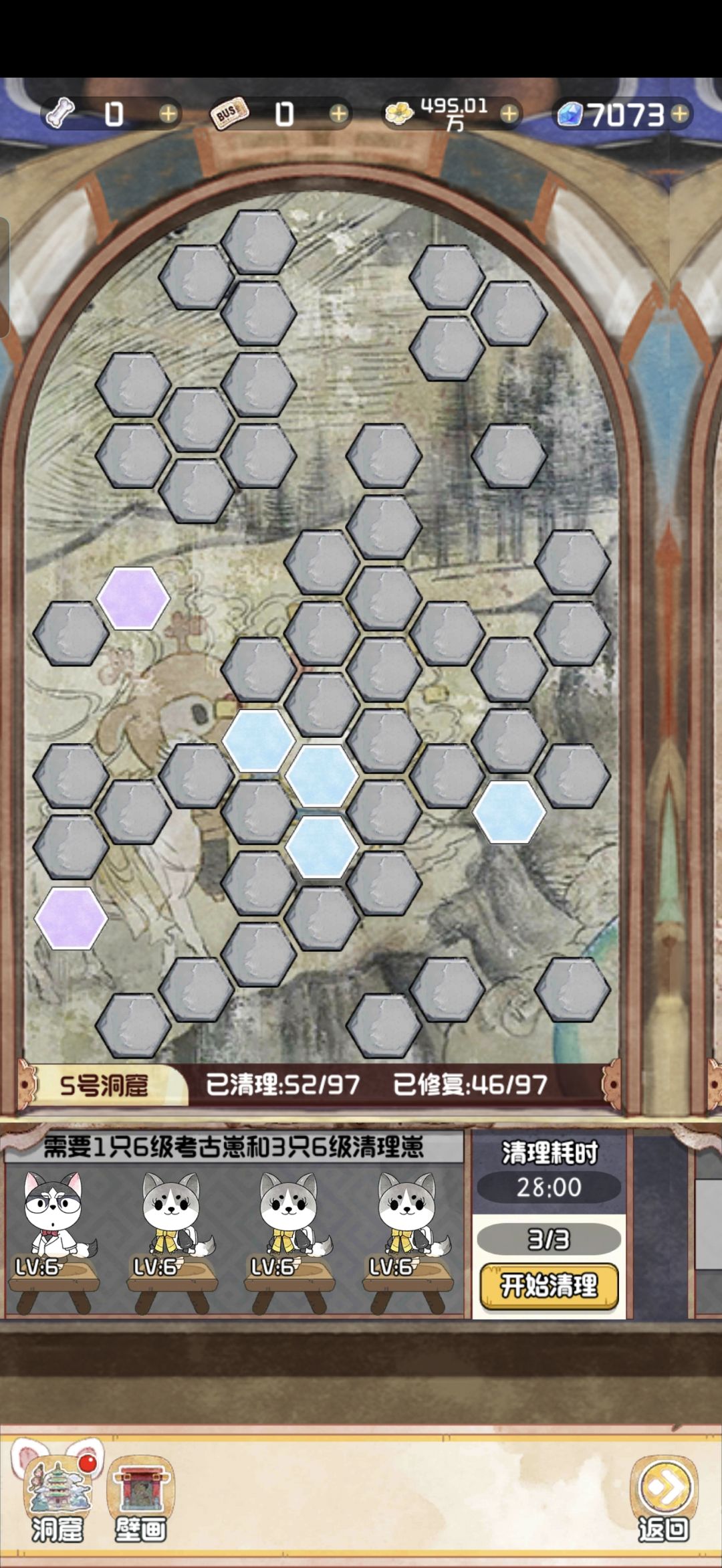 12.28 随着版本今天的更新,云顶洞窟的大饼也是终于烙好了。 其实核心机制就是狗子探险。你可以理解为换了一款小游戏的老探险。只不过这里的文物碎片是靠通关小游戏获得,狗子是用来开启锁定的关卡。 里面主要有两个游戏,一个是数涂,一个是拼图。数涂过关之后可以获得文物碎片和拼图碎片。拼图每拼完一个完整的,可以增加1500点人气值。这个还是很可观的,相当于一个天地兽首了已经。 拼图的游戏机制就不赘述了,相