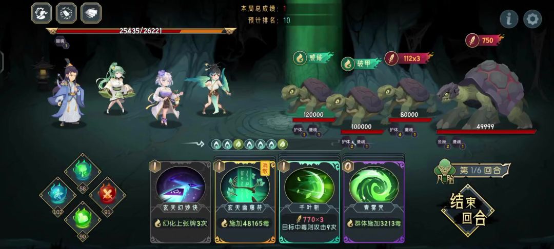 参考大佬们的阵容打的轮椅版本,新人跟着步骤打就行了 今天的上限大概寂灭二到三吧。 开局法力丹把毒给大乌龟用刀破金身(一定要有毒才能9刀) 常规散散散聚散毒爆大乌龟剩下的小怪会被毒死 后面一直这样步骤就行了 真真 真真技能卡手可以平替紫薇
