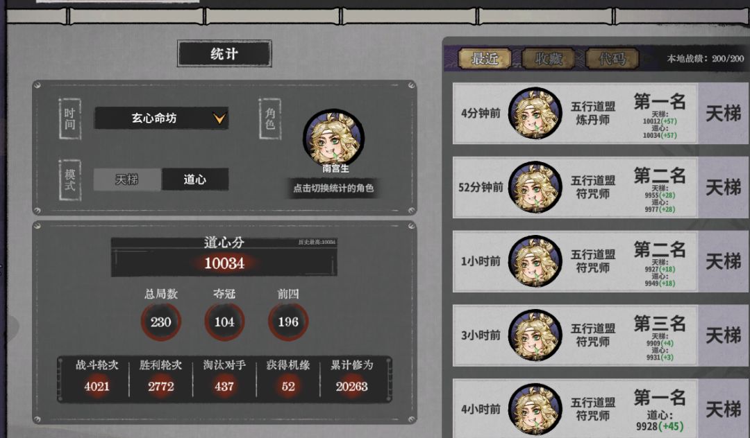 大家好,我是红玉,b站id姜大妍,月播偶尔也会一些攻略。这里粗浅写了一篇符南宫的仙命选择优先级参考,当然符南宫并不适合新手上手,新手去玩会和符炎雪一样有大量的负反馈,所以本篇内容仅适合进阶玩家参考,能用作你玩别的副职南宫的知识多少看个人。 首先按照惯例发一下个人战绩证明不是云玩家,匹配改版前230局万分,匹配改版后270局11000,当前道心榜全角色第一。 首先在选择仙命前要明白一个道理,修为和质