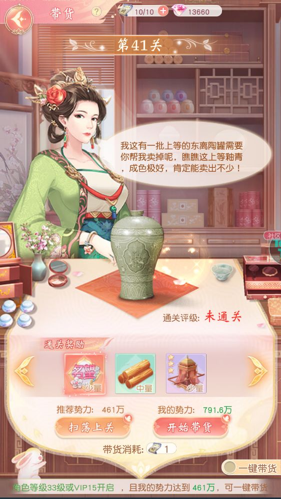 亲爱的掌柜,您商业上的成功让四邻商贾艳羡不已,纷纷提着厚礼登门,恳请您为他们的货物带货开路,盼借您能为他们的生意再添一把火。 玩法入口: 点击游戏下方 "主城—带货" 开启时间: 通关历练关卡 ”第5章第5节“ 开启 玩法消耗: “带货次数”、“铜钱” 带货次数每2小时恢复1次,达到恢复上限后不再恢复。次数也可以点击旁边的加号,选择消耗”带货券“或通过"钻石购买"进行回复。 玩法获得: 通过关卡