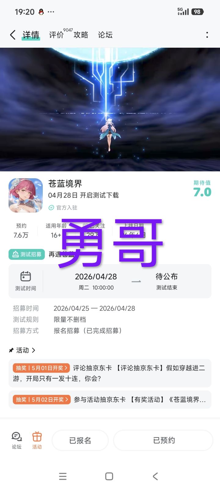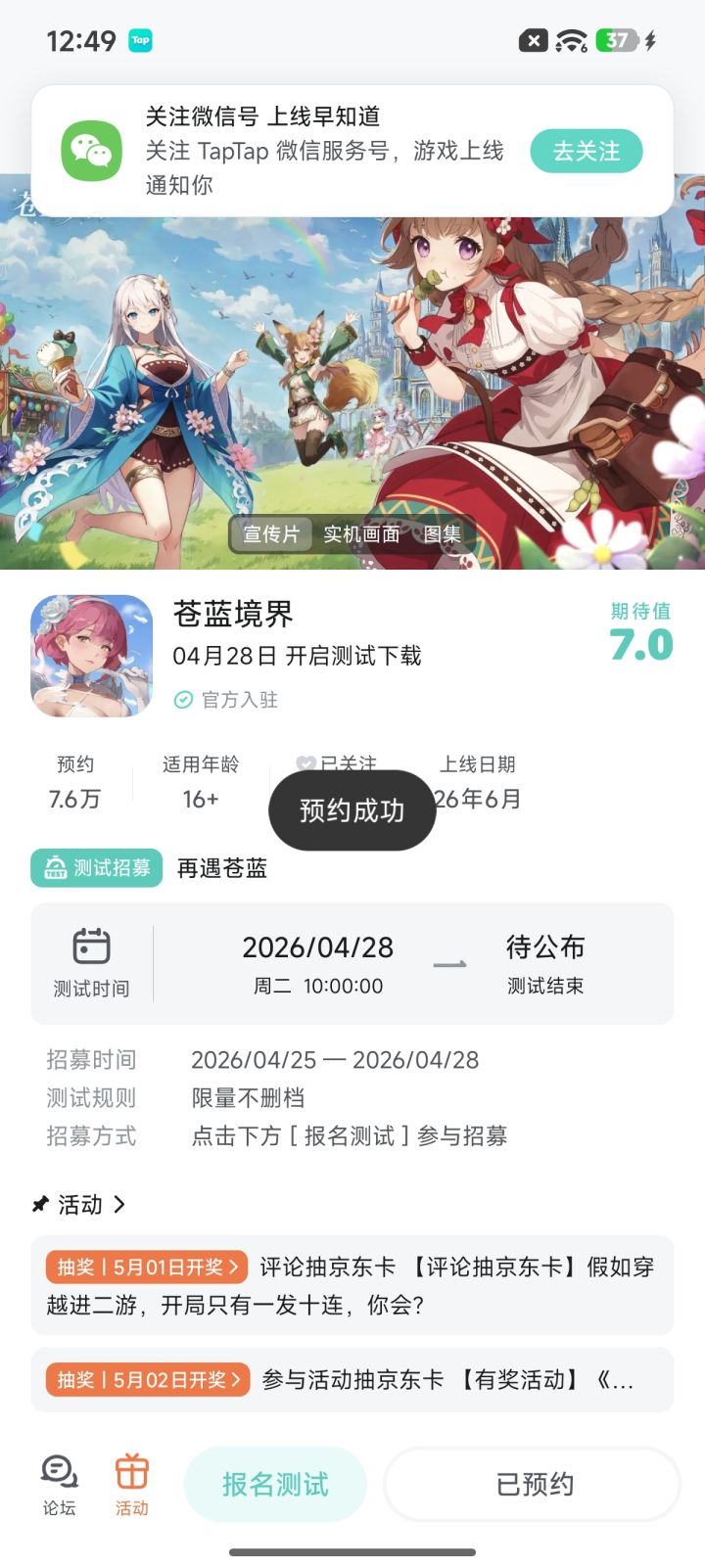 各位玩家好:《苍蓝境界》「再遇苍蓝」限量测试招募开启!你的世界,从此分裂二次元动漫RPG手游《苍蓝境界》是一款综合了角色收集养成、横版即时战斗、多人合作挑战等玩法的二次元角色扮演类手游。游戏画面精美华丽,角色立绘惊艳萌动,风格媲美动漫,背景宏大设定别致,立体呈现绝美的幻想冒险之旅。>>>点击即可参与测试招募参与晒图活动即可抽取京东卡好礼!【参与方式】1.关注《苍蓝境界》且发新帖晒游