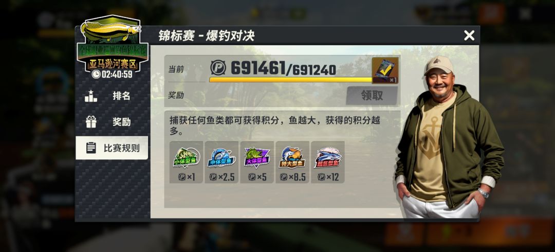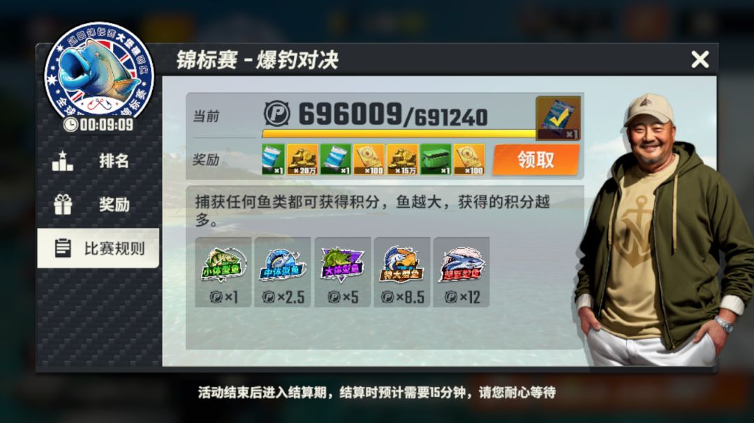 贫民不要碰“金色传说”活动,那是氪金大佬的专属,珍惜体力,当分数达到一定水平,鱼获积分最后是×1.8的,珍惜这次机会,多拿锦标赛积分奖励(排名奖励不要争),我一般拿满69万积分就下线,等待下一波锦标赛,平时69万的分,这次1.8倍,也就是打到平时38万分的水平,积分奖励缩水30万了,很好拿的