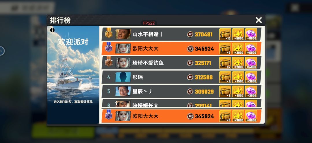 勇争第一! 顺便分享些心得! 一:就钓10体场,重量提升和瓶中信息换着来,就只钓5杆!没有就继续刷继续换钓场。 二:藏宝图控制下体力,钓20体的就欧克!实在不行就钓最低体的宝藏点。 三:锦标赛尽量把奖励拿完!再不济也要把钻石拿走!如果体不够就一直钓3体就行!钻石就用来买4折的金宝箱!#谁是抛杆之王