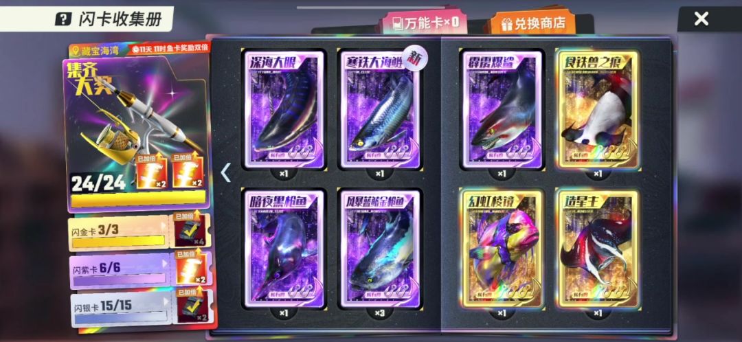 ❶:3万体力保底集齐 1万体1金闪卡 有概率提前出 上次集卡活动 保底会出重复的金色闪卡 所以难 ❷:钓藏宝图20/30体力 不要用高倍钓 藏宝图的机制是100杆一保底典藏 提前出就重制保底 ❸:当你发现一个藏宝图下来全是小鱼 没有奇珍及以上的鱼 就是快要保底了 ❹:闪卡保底优先级 假如你紫卡没有集齐 会被覆盖掉 导致优先出紫卡 藏宝图的保底典藏会变成格灵之翼 ❺:此方法只适用于平民/微氪