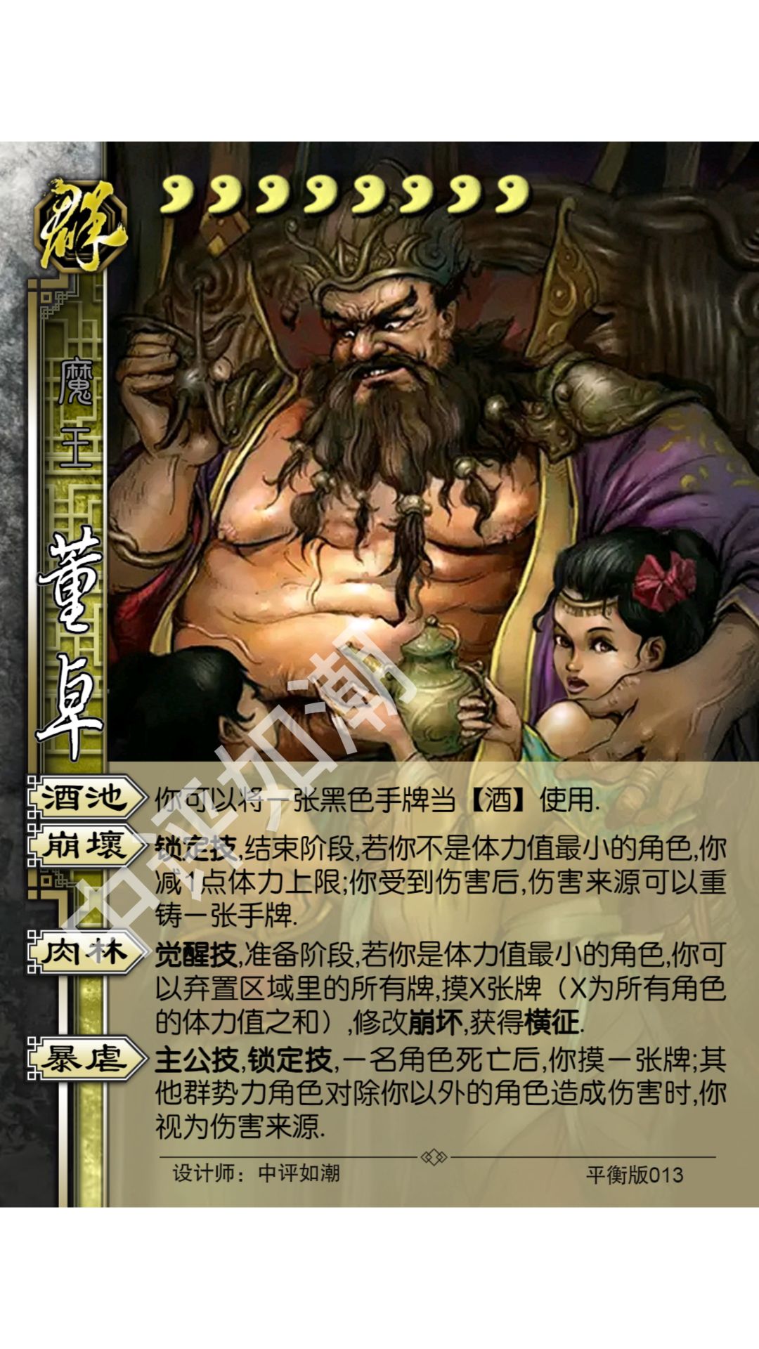 4血 〔被〕会玩:使命技,你拥有制衡。 成功:准备阶段,若你已通过制衡从牌堆中获得至少3张牌,则你升级制衡,获得3点护甲。 失败:若你成功到达使命前进入濒死状态或三回合内通过制衡从牌堆中获得牌的总和少于5张时,则你减一点血量上限并将体力值调至一点,获得崩坏。 〔主〕制衡: 1级.出牌阶段限一次,你可以弃置任意张牌,然后摸等量的牌。 2级.准备阶段限一次,你可以弃置你区域内任意张牌然后摸等量的牌,如
