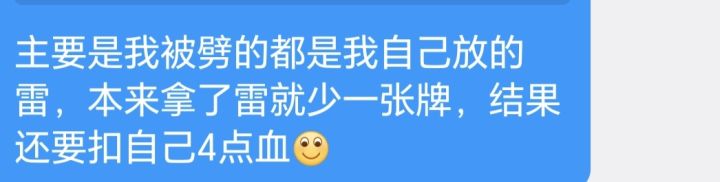 ♧ : 至于你提到伪随机,我简直不能再认同。当我自己抽到好牌,兵乐天过的时候,我会说“哥们运气就是好,这一切都是如此的理所当然。”;但是当对面这样,我就会说“LJ游戏,搞个破伪随机机制来针对我,凭什么对面把把天过,我把把判定中?名将杀这游戏一点都不公平。”