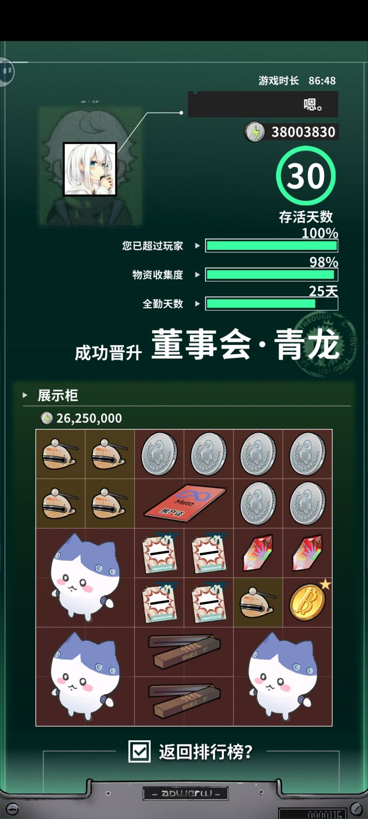 许多年以后 : 本来可以一天不旷,一键补齐,无奈不想赔偿几百万也为了预防后续,所以故意旷了一天,结果没想到就结束了,董事会白虎,不然绝对是青龙的,30天就完事了,鬼知道,然后再点开始游戏又是重头来,算了玩一次就体验就行了