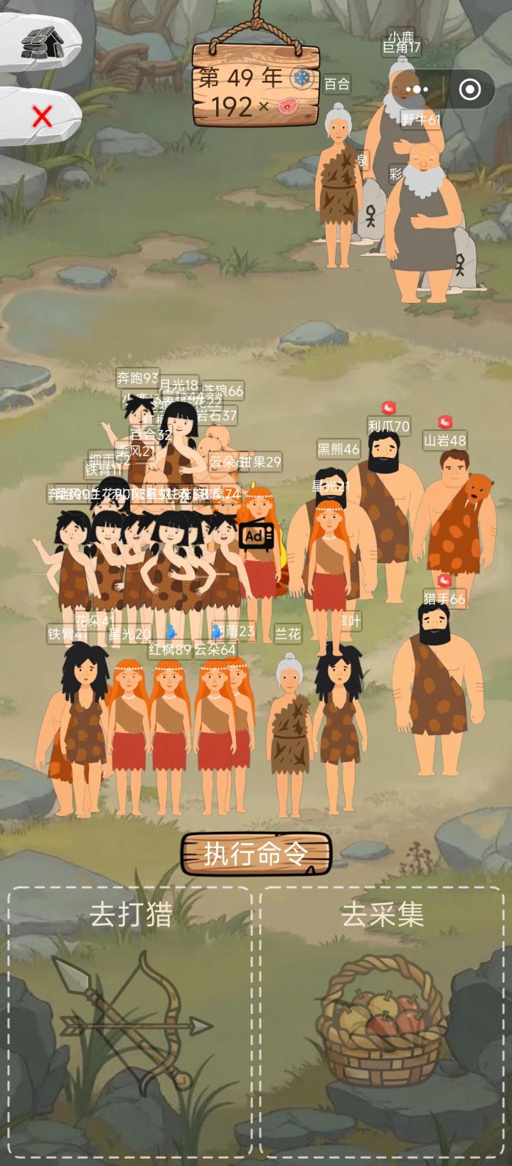 不错的小游戏,要是能自己取名就好了,前期孩子生晚了,人物老了就不能干活了,生了三个小孩后人都老了两个了,为了多生两个,只能让俩个未成年养家,结果那俩大人到老都没生,后面熬到小孩长大,老人死了,才活过来,小孩不能打猎,只能采集,采集的食物也少,早知道趁着年轻多弄点食物了,打猎概率受伤,收益高,采集收益少,不会受伤