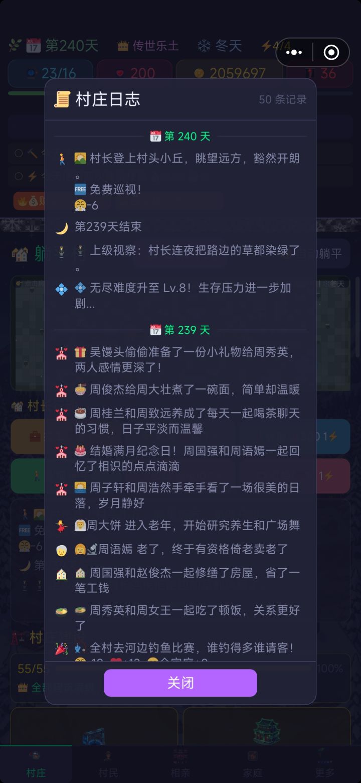 生产队的驴听了直摇头...今天还有一个全新版本~加入了很多新内容可以再体验一下噢!经过了很多轮优化,最初始上线的版本我已经不认识了,生育上限的问题我考虑加入年龄系统,年纪越大生育成功率越低进行优化呢~也会在今天的版本加入!