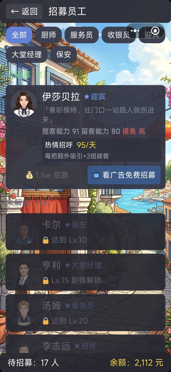 : 1可以点击上面的时钟暂停看文字。2的确文案有点单一了,因为只有一个人做,所以每个员工只来了10多句台词,如果重复的盘数多了,的确会感觉到单一,这一点十分的抱歉,以后我们会努力改进的。3翻台率可以通过提升店铺,增加桌椅等设施,同时招募更多员工来解决;而且火爆到接待不过来也是游戏的设定,这一般是顾客满意度超高的情况出现。4感谢你对游戏的支持!