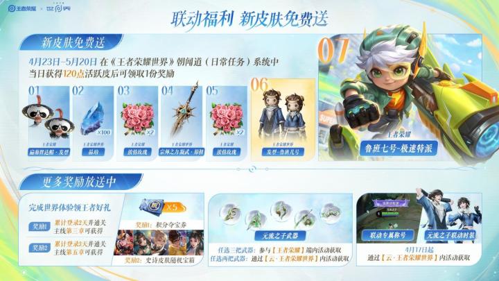 到世界冒险 领王者荣耀鲁班七号新皮肤!前往王者荣耀世界游戏,每达成一次王者荣耀世界-朝闻道活动的满活跃度要求,即可在王者荣耀领取对应进度奖励,最多可领7次,奖励丰富,不容错过活动时间:4月23日逐步开启~5月20日活动奖励:王者荣耀鲁班七号-极速特派皮肤、元流之子-扁萌胖达帽、浓情玫瑰,王者世界-鲁班几号发型、宗师之力外观、晶珀 鲁班七号-极速特派皮肤上架商城咻~特派小鲁班,光速送餐~品