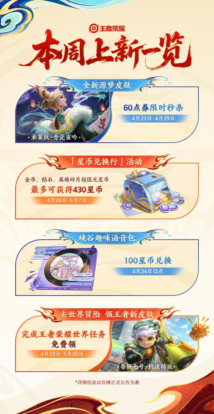 本周新内容抢先看——全新源梦皮肤【米莱狄-青瓷雀吟】60点券限时秒杀!【星币兑换行】活动开启,金币、钻石、英雄碎片超值兑星币,最多可获得430星币!峡谷趣味语音包上新!完成王者荣耀世界任务,免费领王者【鲁班七号-极速特派】新皮肤!