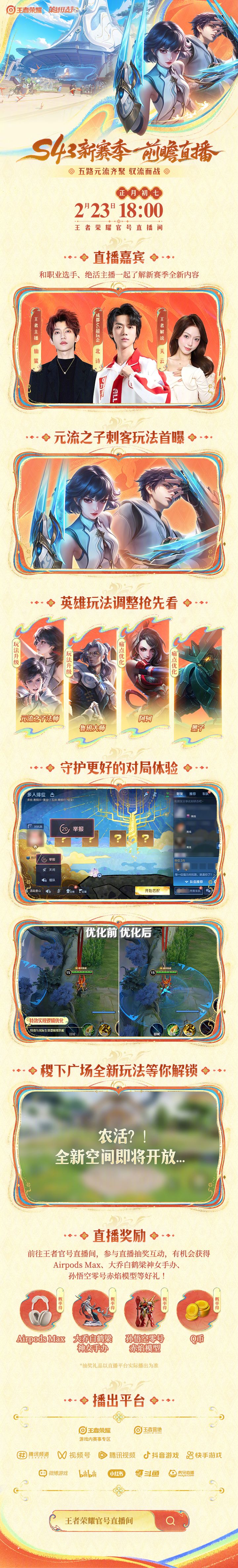 首先是S43赛季的前瞻直播定档,今晚6点就要开了。新赛季元流之子的刺客职业登场,部分英雄玩法调整,阿珂、墨子这些老英雄更改了玩法痛点,玩起来只会比以前更爽了。至于举报系统,看起来是要优化判定逻辑、提升处理效率,希望这次是真的优化,别又是个花架子。