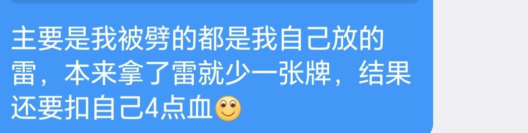 还有这个雷,我本来不想说的,我都习以为常了,自己当时玩的时候也挺有意思的,但是记录小乔这局后我又想顺便说一下。我放的雷老是炸我第一张图是和我一起开房间玩的人,我放了一次雷炸我自己。下一局天雷就炸到了他但是我们四个反贼用铁锁连起来了。补充一下,开房间之前我打的一局军八,也是我放的雷炸我自己。就在半小时炸了我三回。