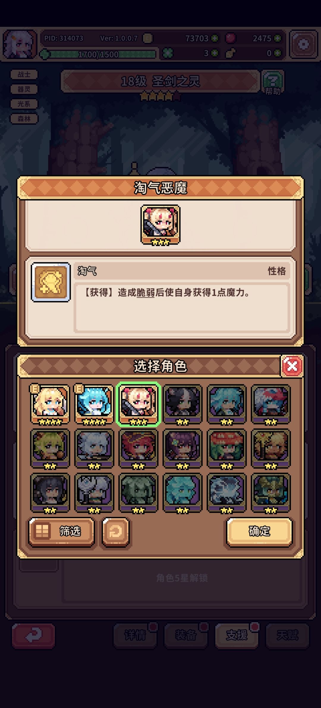 还有一个角色支援机制,一个角色可以配其他三个角色的支援获得他们的性格、称号、特性其中之一的技能。也可以算作刷词条的一种,收集角色嘛。(如图二)